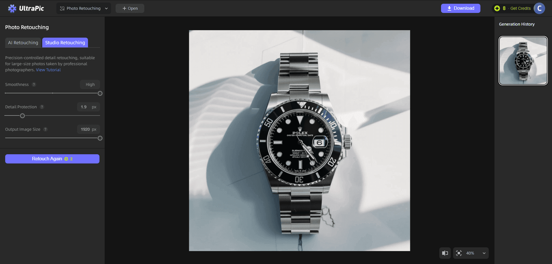 Step 3. Then, click Start Retouching to run this furniture photo retouching service. You can zoom in to inspect edges, surfaces, and color consistency. Not satisfied with the generated results? Adjust the corresponding settings and click Retouch Again to generate a new result.
