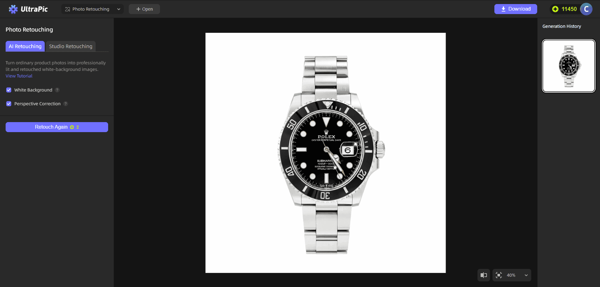 - AI Retouching Mode: Exclusively for amateur-shot product photos. It enables one-click automated retouching with features like automatic background removal, professional lighting reconstruction, intelligent product imperfection removal (dust, smudges, minor scratches), and overall image quality enhancement.