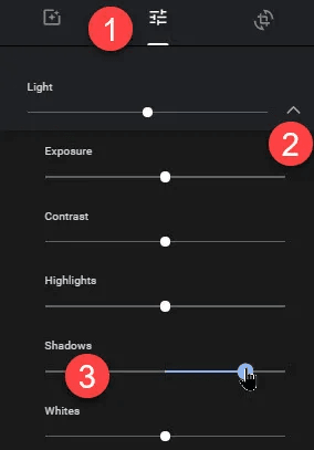 Step 2. Tap the adjustment icon and find Shadows. Slide it to the right to brighten shadowed areas.