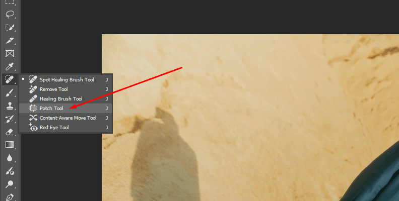 Step 3. Click the Healing Tool on the left toolbar and choose Patch Tool. Then, drop down the Patch option, and choose Content-Aware.