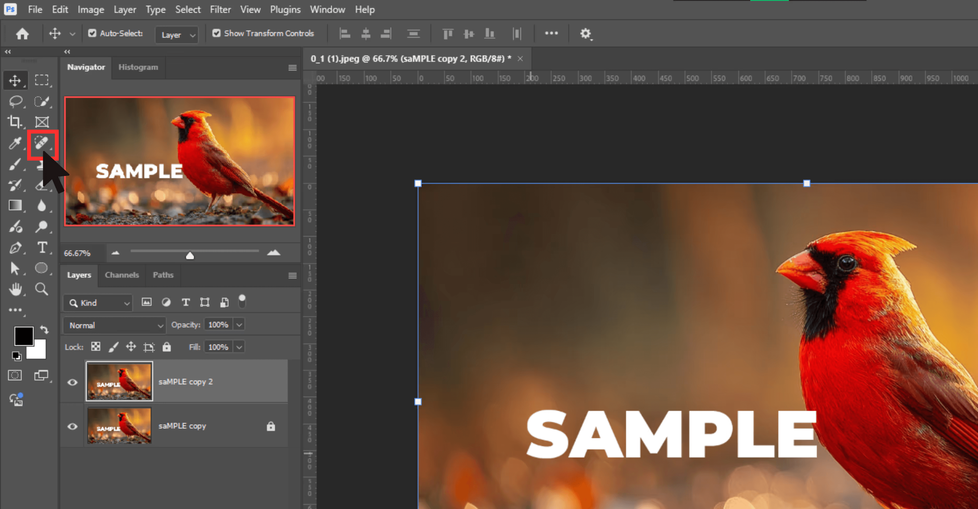 - Spot Healing Brush Tool - This tool automatically replaces selected areas with nearby pixels. It works well for small watermark fragments.