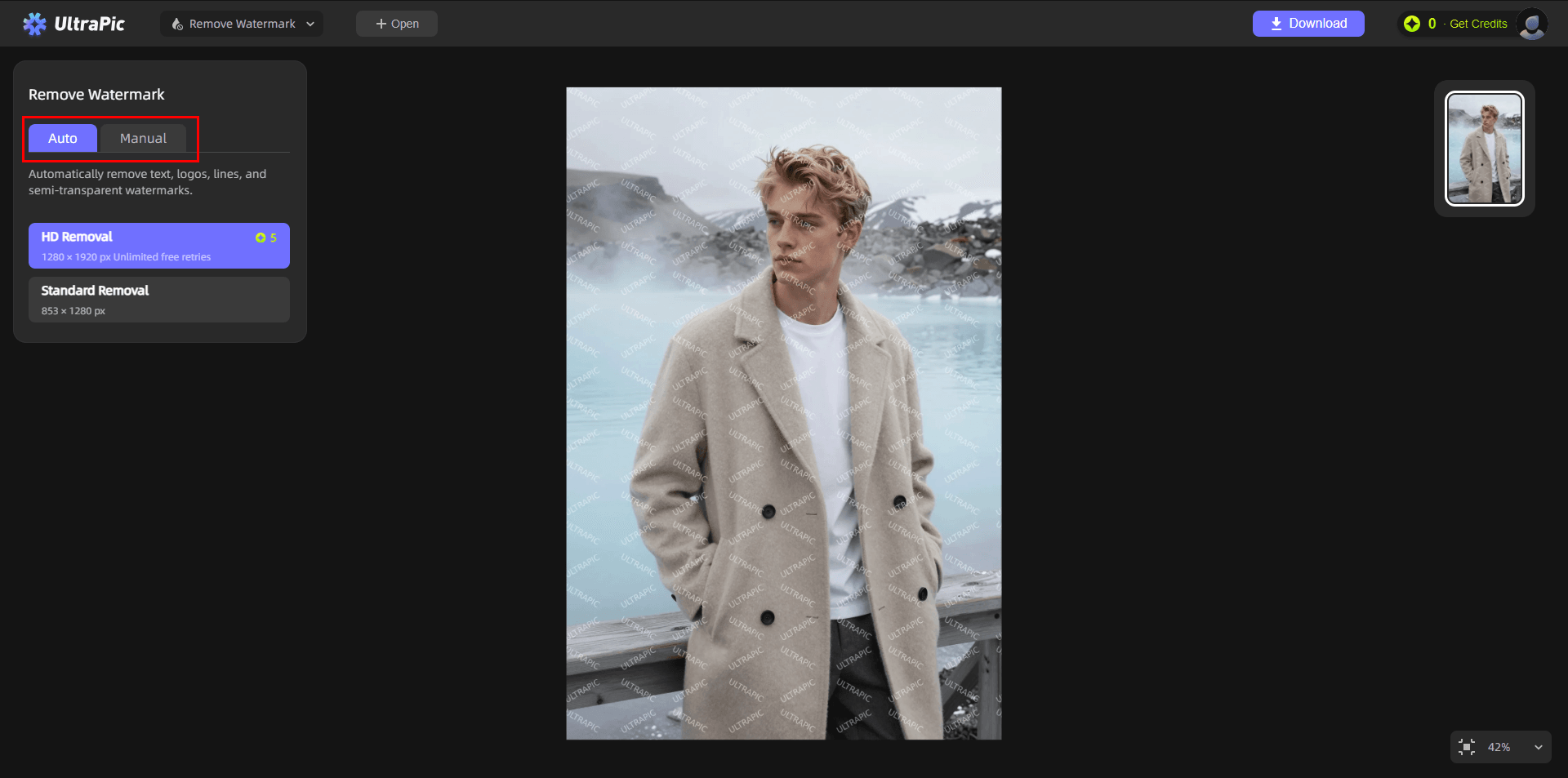 However, manual editing requires time and experience. For users who want a faster solution, AI-powered tools such as UltraPic provide a convenient alternative. With just a few clicks, the system can detect and remove watermarks automatically while preserving surrounding textures. It can also be used as a text to background generator for you to use text prompts to efficiently create stunning images.