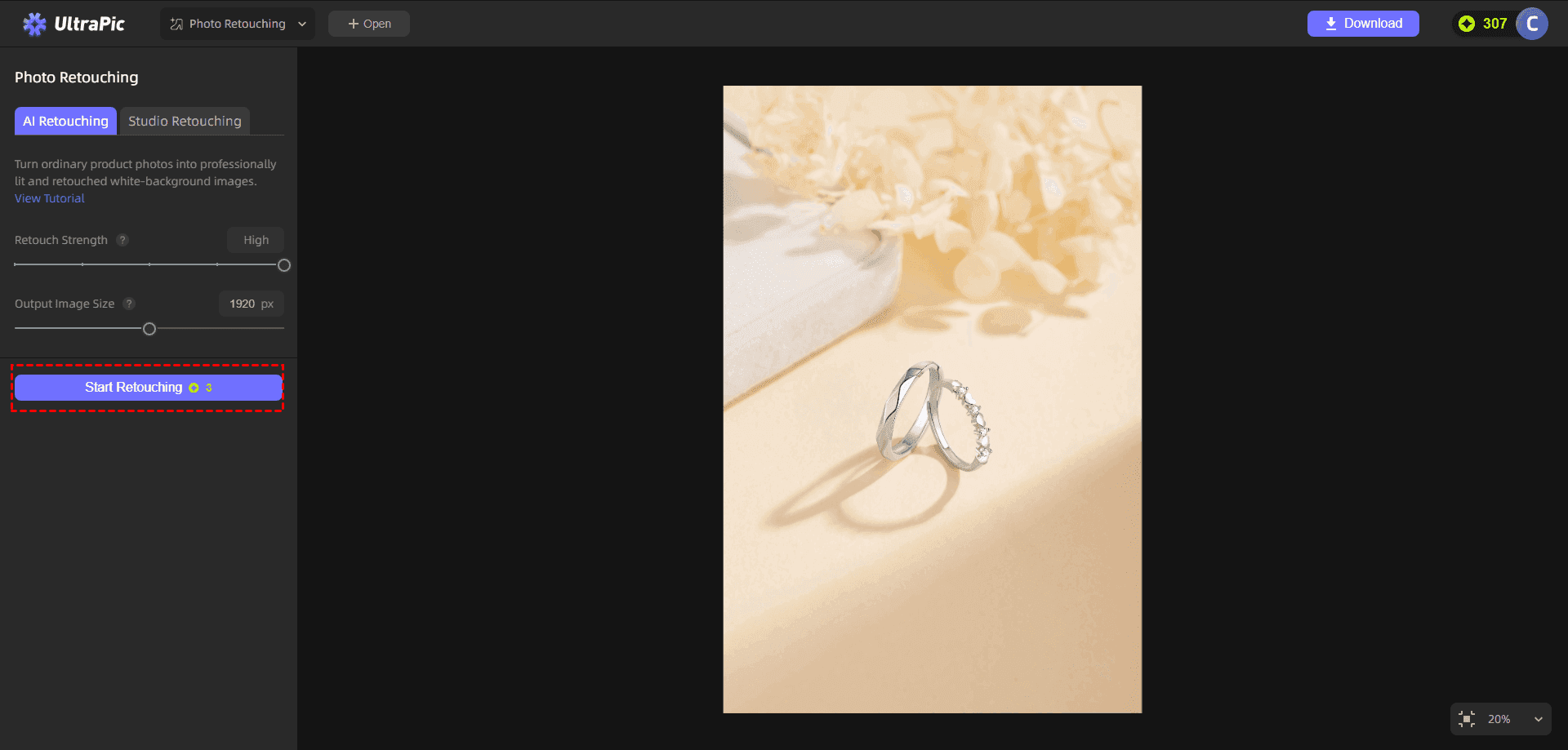 Step 3. Then, click Start Retouching. You can adjust the corresponding settings in Studio Retouching mode, and click Retouch Again to generate a new result.
