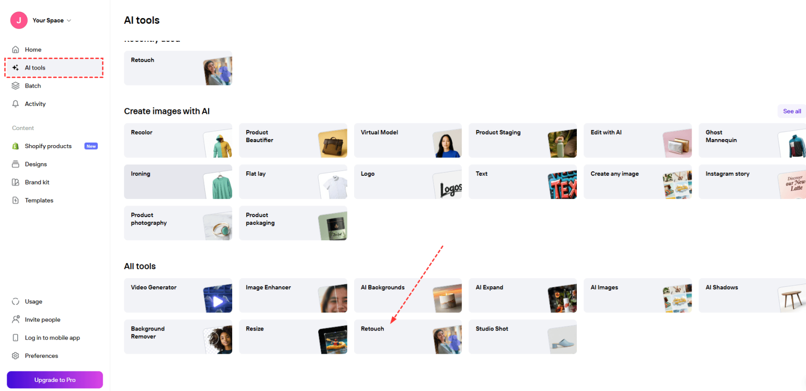 Step 1. Open Photoroom on the web. Click on AI tools from the left menu, and select Retouch under all tools.